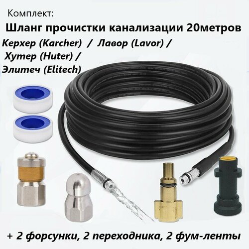 Шланг прочистки канализации 20 метров + 2 форсунки + 2 адаптера + 2 фум-ленты