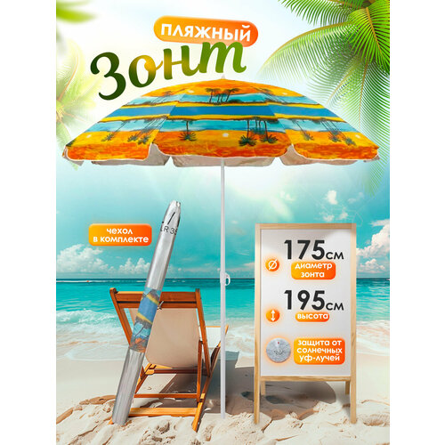 Зонт пляжный большой складной, садовый от солнца для отдыха 1,75 м в чехле, (оранжевый/принт "Песчаный пляж") 35LR