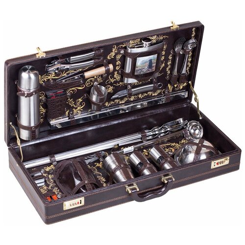колчан из натуральной кожиПодарочный набор для шашлыка - комплект аксессуаров для приготовления мяса на огне и подачи блюда к столу во время пикника. Состав различен, но из шашлычных принадлежностей здесь есть шампуры (или решетка для гриля) и вещи для сервировки барбекю. Продаются такие сеты обычно в кейсе или в колчане, но допустима и иная упаковка.