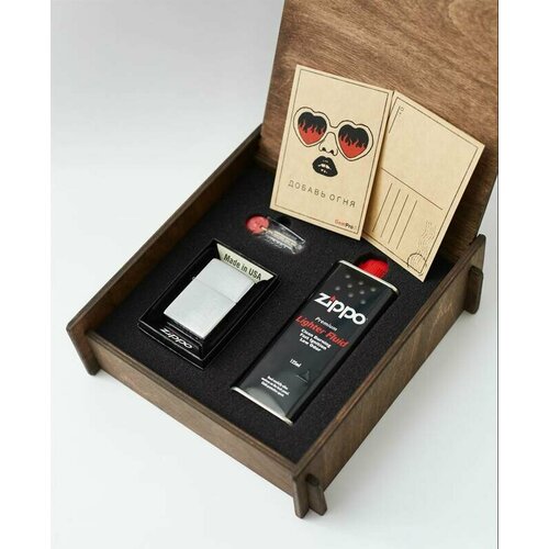Подарочный набор оригинальная зажигалка Zippo 200 с топливом 125 мл + кремнии в деревянной коробке