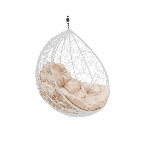 Подвесное кресло капля (без стойки), с ротангом белое, бежевая подушка