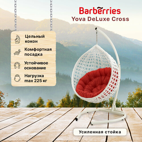 Подвесное кресло кокон садовое Barberries Yova DeLuxe Cross. Стойка белая до 225 кг, подушка круглая красная