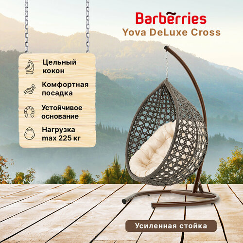 Подвесное кресло кокон садовое Barberries Yova DeLuxe Cross. Стойка венге до 225 кг, подушка круглая бежевая