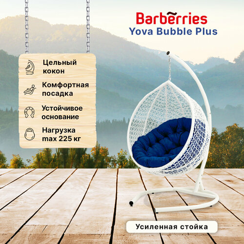 Подвесное кресло кокон садовое Barberries Yova Bubble Plus. Стойка белая до 225 кг, подушка круглая синяя