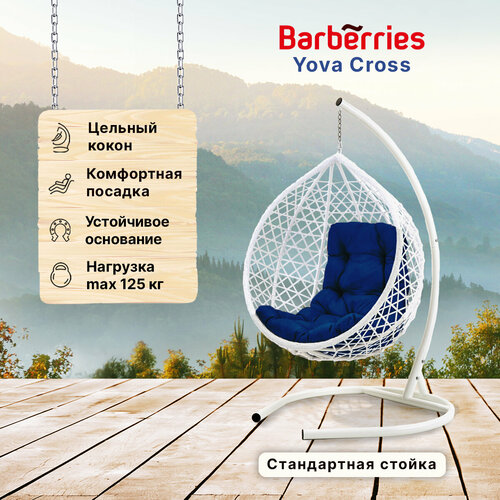 Подвесное кресло кокон садовое Barberries Yova Cross. Стойка белая до 125 кг, подушка трапеция синяя