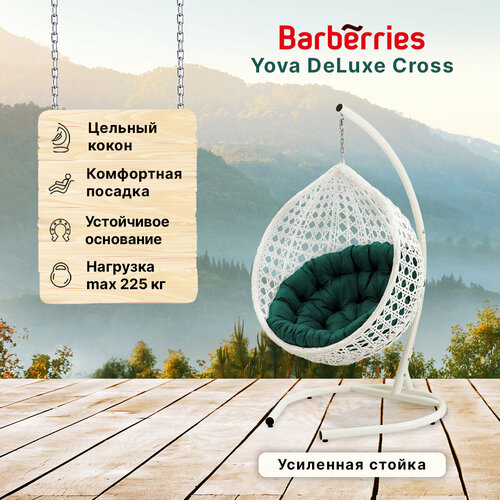 Подвесное кресло кокон садовое Barberries Yova DeLuxe Cross. Стойка белая до 225 кг, подушка круглая зеленая