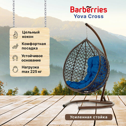 Подвесное кресло кокон садовое Barberries Yova Cross. Стойка венге до 225 кг, подушка трапеция синяя