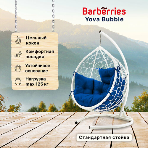Подвесное кресло кокон садовое Barberries Yova Bubble. Стойка белая до 125 кг, подушка комфорт синяя