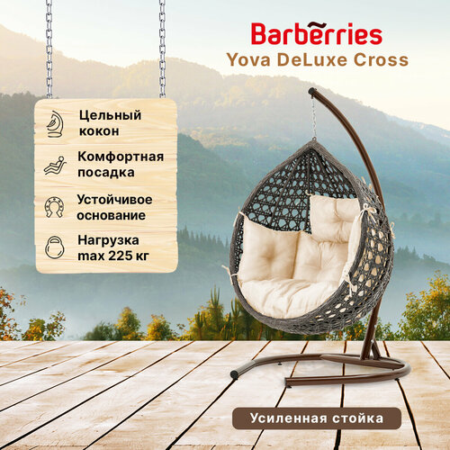 Подвесное кресло кокон садовое Barberries Yova DeLuxe Cross. Стойка венге до 225 кг, подушка комфорт бежевая