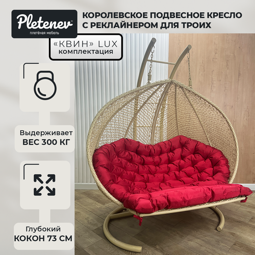 Подвесное кресло Queen трехместное Бежевое с реклайнером (с подножкой) и Красной водоотталкивающей подушкой