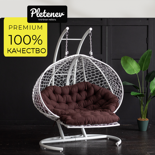 Подвесное кресло Pletenev Двухместное реклайнер белое с коричневой подушкой