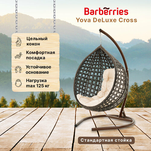 Подвесное кресло кокон садовое Barberries Yova DeLuxe Cross. Стойка венге до 125 кг, подушка трапеция бежевая