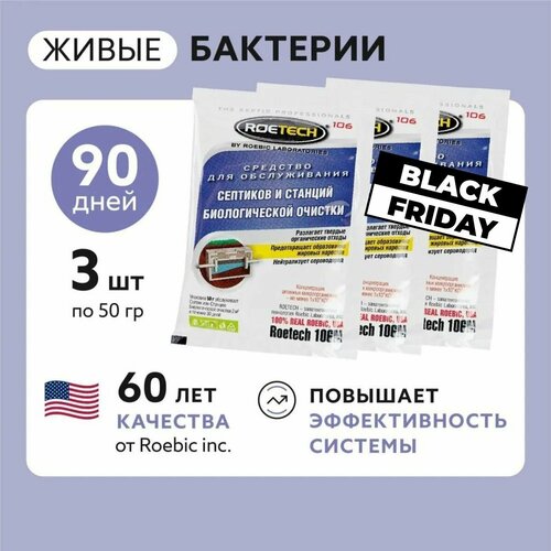Средство для септиков и станций биологической очистки, живые бактерии Roetech 106М, набор 3 пакета по 50 гр.