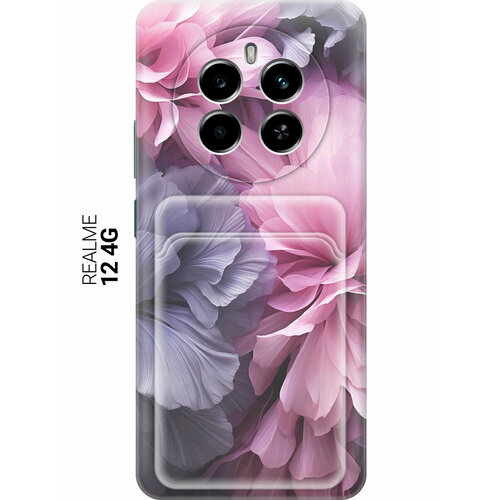 Силиконовый чехол на Realme 12 4g с принтом "Розово-фиолетовые цветы" с карманом для карты прозрачный