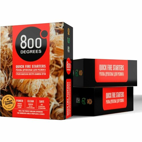 Древесные роллы 800 Degrees премиум-класса легко разжигаются и горят так же, как уголь, они рассчитаны на постоянно высокую теплоотдачу при медленном времени горения. Упакованы в удобные картонные коробки. Производятся по уникальной технологии из древесных стружек лиственных пород деревьев. Вся продукция рекомендована для приготовления пищи Русским Обществом Барбекю (РОБ) к применению во всех типах угольных и дровяных грилей, хосперах, а также в мангалах, печах и очагах.