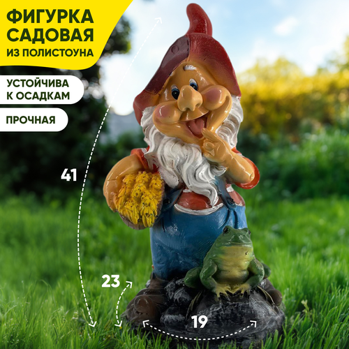 Садовая фигурка для дачи, сада и огорода на газон 'Гномик с лягушкой на камне 41x23x19 см'.