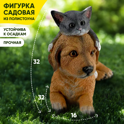 Садовая фигурка для дачи, сада и огорода на газон 'Собачка с котиком 32x32x16 см'.