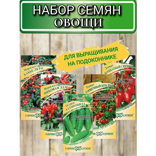 Семена овощей Гавриш на подоконнике: перец Бабье лето, Пиковая дама, томат Горшочный красный, Комнатный сюрприз, огурец