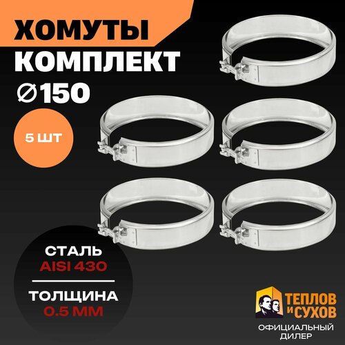 Комплект хомут трубный обжимной 150 для дымохода на болте 5 шт, нержавейка AISI 430, Теплов и Сухов