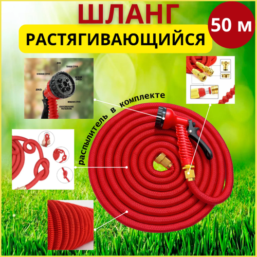 Шланг садовый растягивающийся 50 метров для полива с распылителем Magic Garden Hose Xhose / 50 метров красный с металлическим соединением