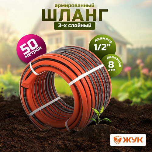 Шланг поливочный садовый 1/2 50 м армированный трехслойный, диаметр 12.5 мм, Жук