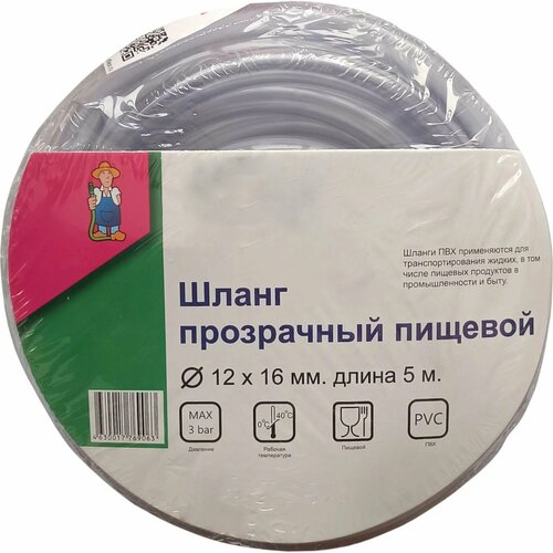 бесцветный, прозрачныйШланг ПВХ пищевой 16x1.6 мм, 15 м прозрачный - незаменим в домашнем хозяйстве и на даче. Подходит для молока, напитков и алкоголя.