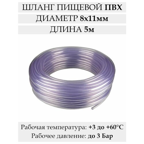 Шланг пищевой прозрачный 8х11 мм, 5 м, трубка пищевая гибкая