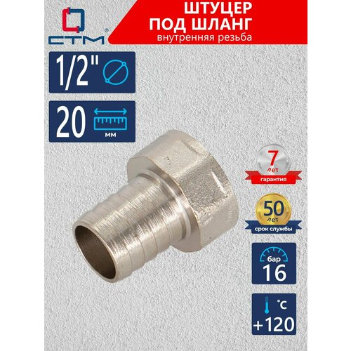 Штуцер 1/2"х20 мм под шланг с внутренней резьбой никелированная латунь CTM