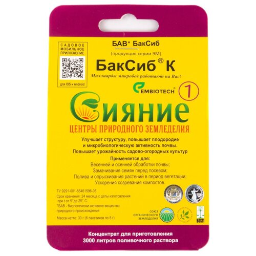 Удобрение Сияние -1, БакСиб К, концентрат для приготовления 3 000 литров раствора (30 гр. (6 пакетиков по 5 гр