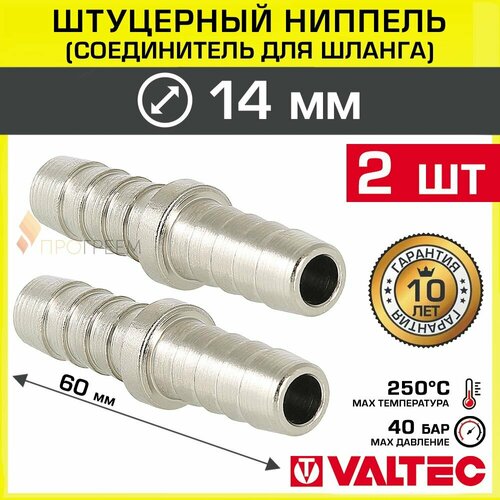 2 шт - Соединитель 14 мм для шланга высокого давления VALTEC, латунный / Переходник - штуцерный ниппель елочка диаметром 14мм для подключения 2-х поливочных трубок, арт. VTr.657. N.1414