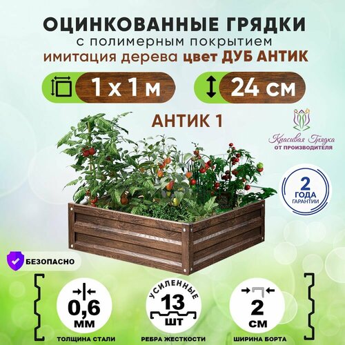 Грядки оцинкованные на дачу с полимерным покрытием усиленные 1х1 метр АНТИК1/ ограждения металлические для растений в теплицу и открытый грунт / грядка для сада и огорода высота борта 24 см
