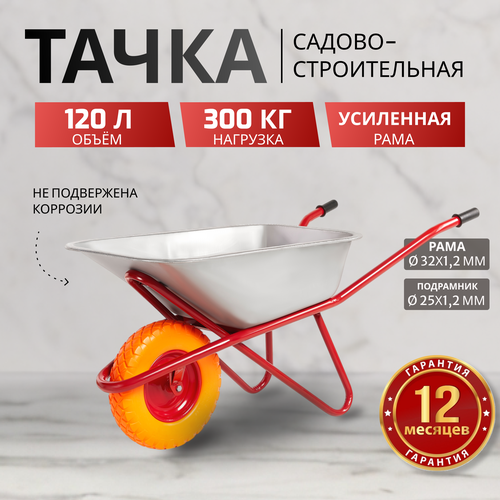 Тачка садовая / строительная AVTOFOKS, 120л объём и 300кг грузоподъёмность, усиленная, одноколёсная, оцинкованный кузов