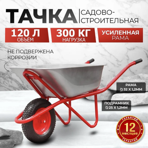 Тачка садовая / строительная AVTOFOKS, 120л объём и 300кг грузоподъёмность, усиленная, одноколёсная, оцинкованный кузов