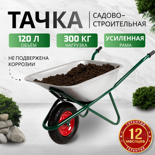 Тачка садовая/строительная AVTOFOKS, 120л объём, 300кг грузоподъёмность, усиленная, одноколёсная, оцинкованный кузов