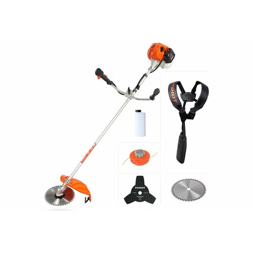оранжевыйТриммер бензиновый PT 558 (3 л. с.) для покоса на лужайке и неровных площадях. Триммер — садовая техника для густой травы, сорняков, сухой поросли.