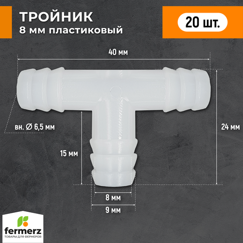 Тройник 8мм пластиковый Т образный 20 шт белый