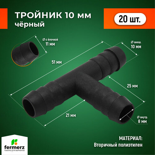 Тройник 10мм пластиковый Т образный - 20шт черный. Фитинг переходник 10 мм для трубки для шланга