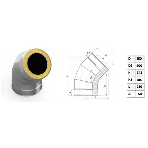 Отвод дымохода сэндвич, угол 135*, диаметр 150*220, Нержавеющая сталь 0,5мм/0,5мм, УМК