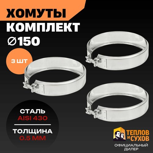 Комплект хомут трубный обжимной 150 для дымохода на болте 3 шт, нержавейка AISI 430, Теплов и Сухов