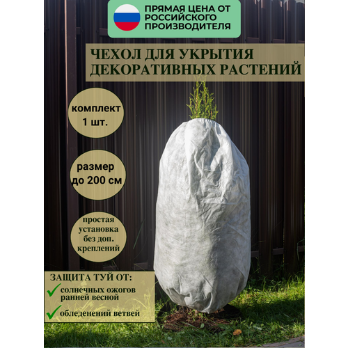 белыйЗащитный чехол для кустов и деревьев сшит из полипропиленового нетканого материала Спанбонд (плотностью 60 гр/м2) Отлично подойдет для молодых туй, можжевельников, хвойных растений, декоративных растений и для роз. Такой чехол поможет защитить растения, кустарники и деревья от: зимних морозов, обильных снегопадов, обледенений, что особенно актуально в нашей широте, А самое важное от солнечных ожогов в конце зимы-начале весны-что особенно актуально для молодых туй Спанбонд это легкий и дышащий материал, он бережно укутывает растение, сохраняя естественное направление роста ветвей и пропуская достаточное количество солнечного света. Чехлы можно использовать без дополнительного каркаса, просто одев на растение и затянув завязки( соберите чехол "как чулок" наденьте на растение до самой земли, затяните нижние завязки. Далее расправьте чехол вверх и затяните завязки наверху) Чехлы не разрушаются под воздействием солнечных лучей и атмосферных осадков, предназначены для многолетнего использования Укрытие устанавливае