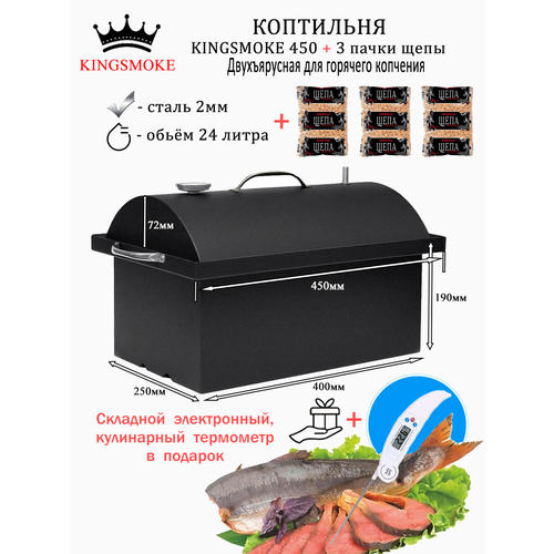 Коптильня KINGSMOKE 450 с термометром и рёбрами жёсткости на дне + 3 пачки ольховой щепы (+термощуп в подарок)