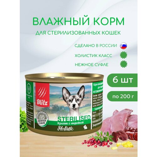 BLITZ HOLISTIC STERILIZED для взрослых кастрированных котов и стерилизованных кошек суфле с кроликом и индейкой (200 гр х 24 шт) Blitz