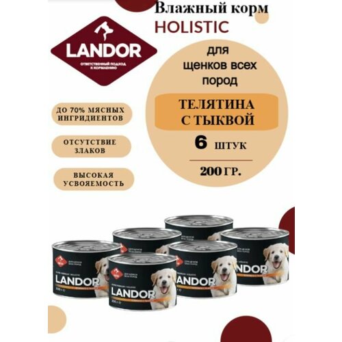 Влажный корм (консервы) для щенков всех пород, телятина с тыквой, 200г х 6шт. Landor