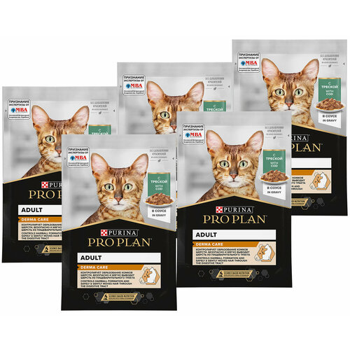 PRO PLAN DERMA CARE для взрослых кошек для здоровья кожи и шерсти с треской в соусе пауч 85 гр пауч 85 гр х 5 шт Pro Plan