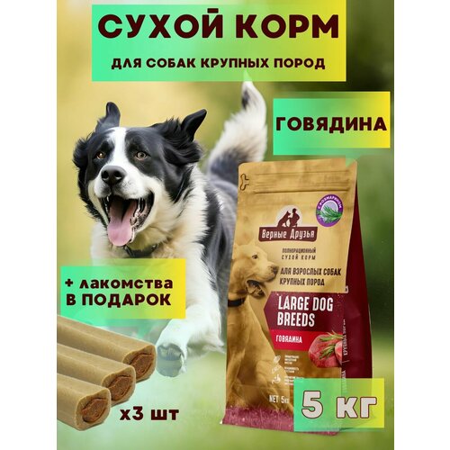 Корм для собак сухой Верные друзья, премиум, полнорационный, для крупных пород "Говядина", 5 кг. Лакомство в подарок.