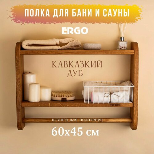 Деревянная настенная полка банная Woodson ERGO 60*45 см дуб кавказкий, со штангой для полотенца