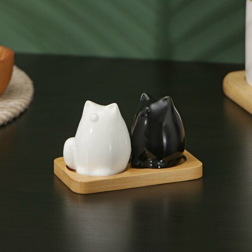 Набор фарфоровый для специй на деревянной подставке, 2 предмета: солонка, перечница, цвет белый и чёрный