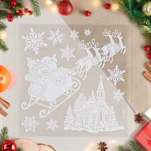 Наклейки на окна Новогодние Дед Мороз, сани, дом, 26х21 см