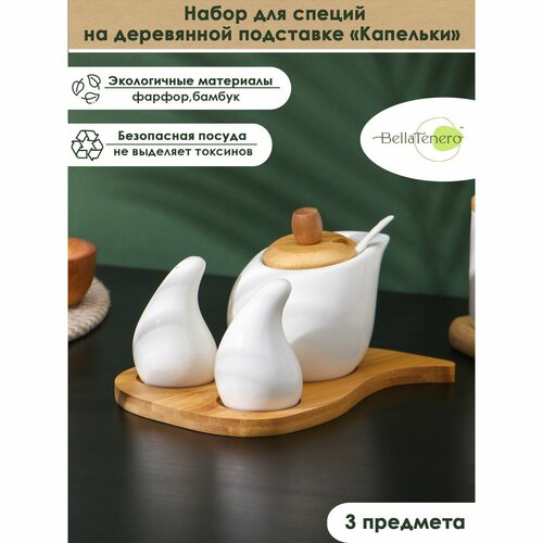 Набор для специй на деревянной подставке BellaTenero «Капельки», 3 предмета: солонка 60 мл, перечница 60 мл, сахарница с ложкой 330 мл