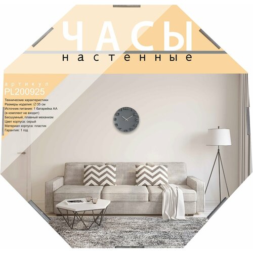 Большие круглые настенные часы MIRRON P2274A СБ/Часы диаметром 34 см/Серый часы/Часы с большим белым циферблатом/Крупные арабские цифры/Часы в подарок/Бесшумные кварцевые часы